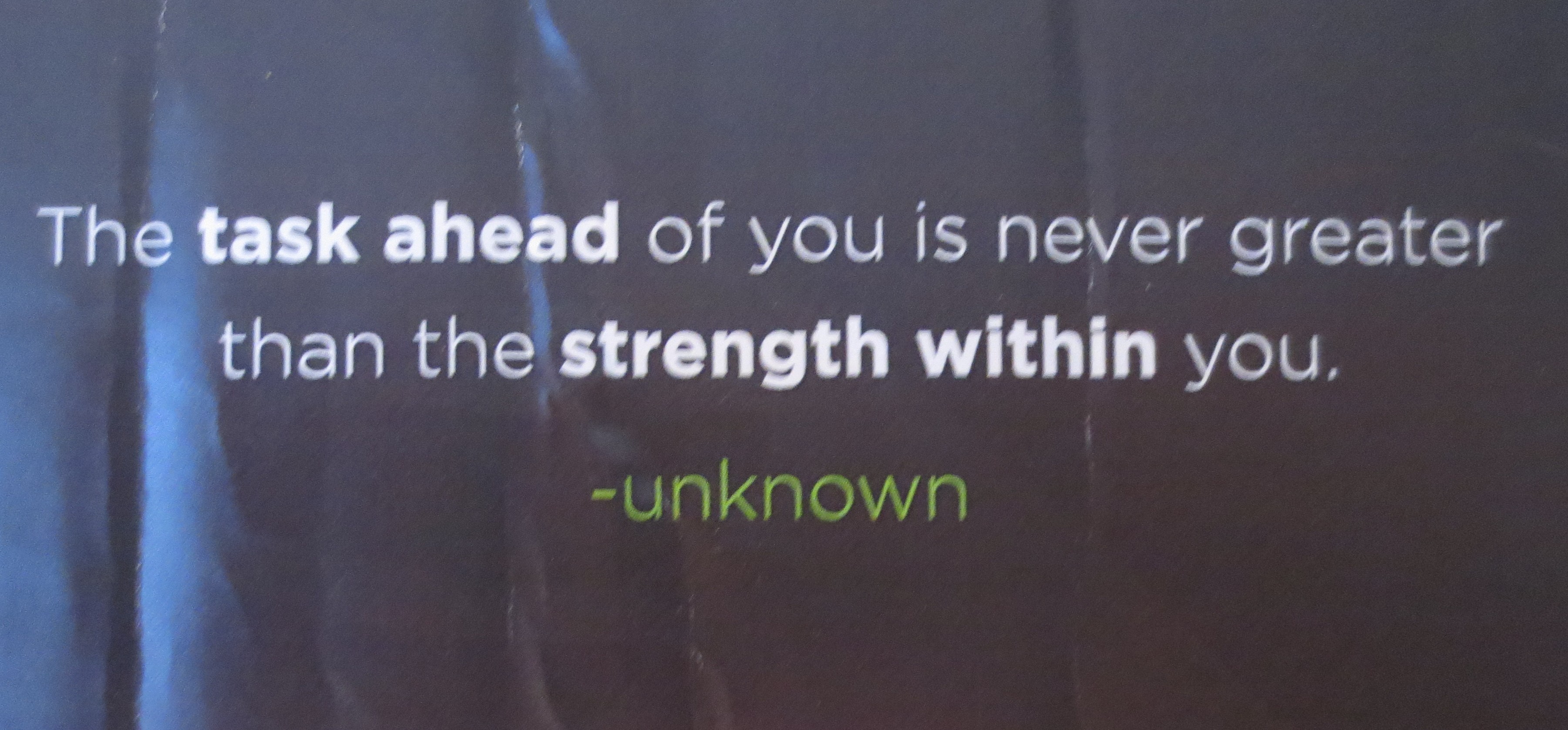 As I was getting out my mug and bowl, etc and waiting for the water I looked up and on top of the fridge I saw my Runner Box (you can Google that later if you do not know what it is). I reached up and took it down to see what was left inside. I pulled out a few things and gathered some paperwork still in there to throw it away when I noticed writing on the lid and on the lid was a quote – “The task ahead of you is never greater than the strength within you.”